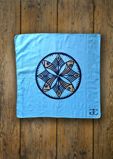 Petite tenture décorative de coton bleu ciel, imprimée à l'aide d'un bois gravé et rehaussée de dorures.